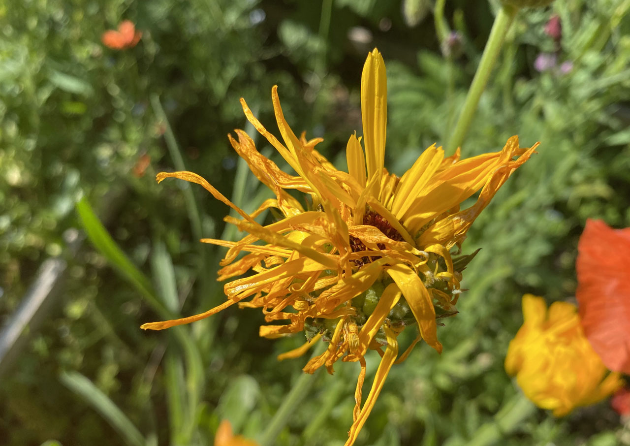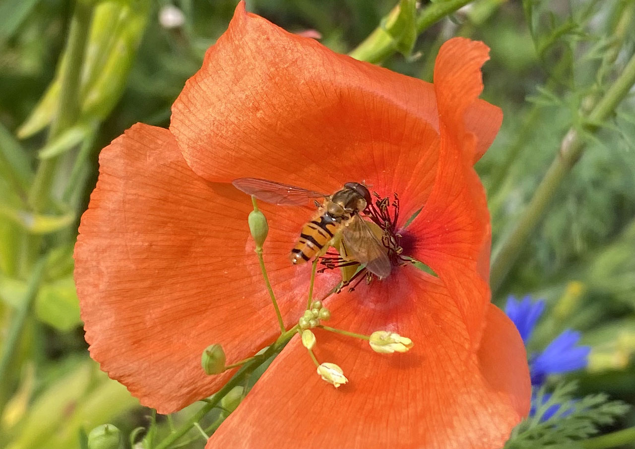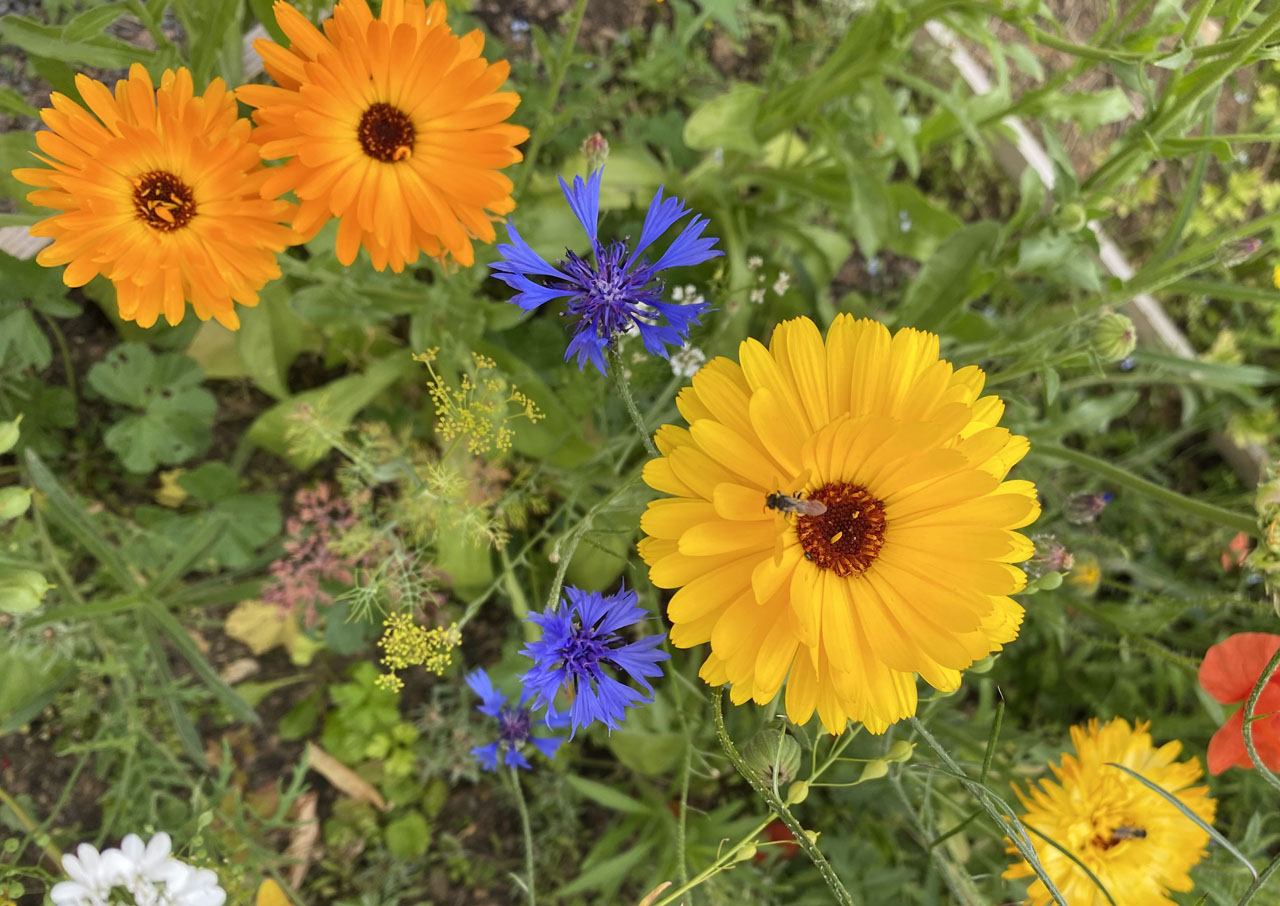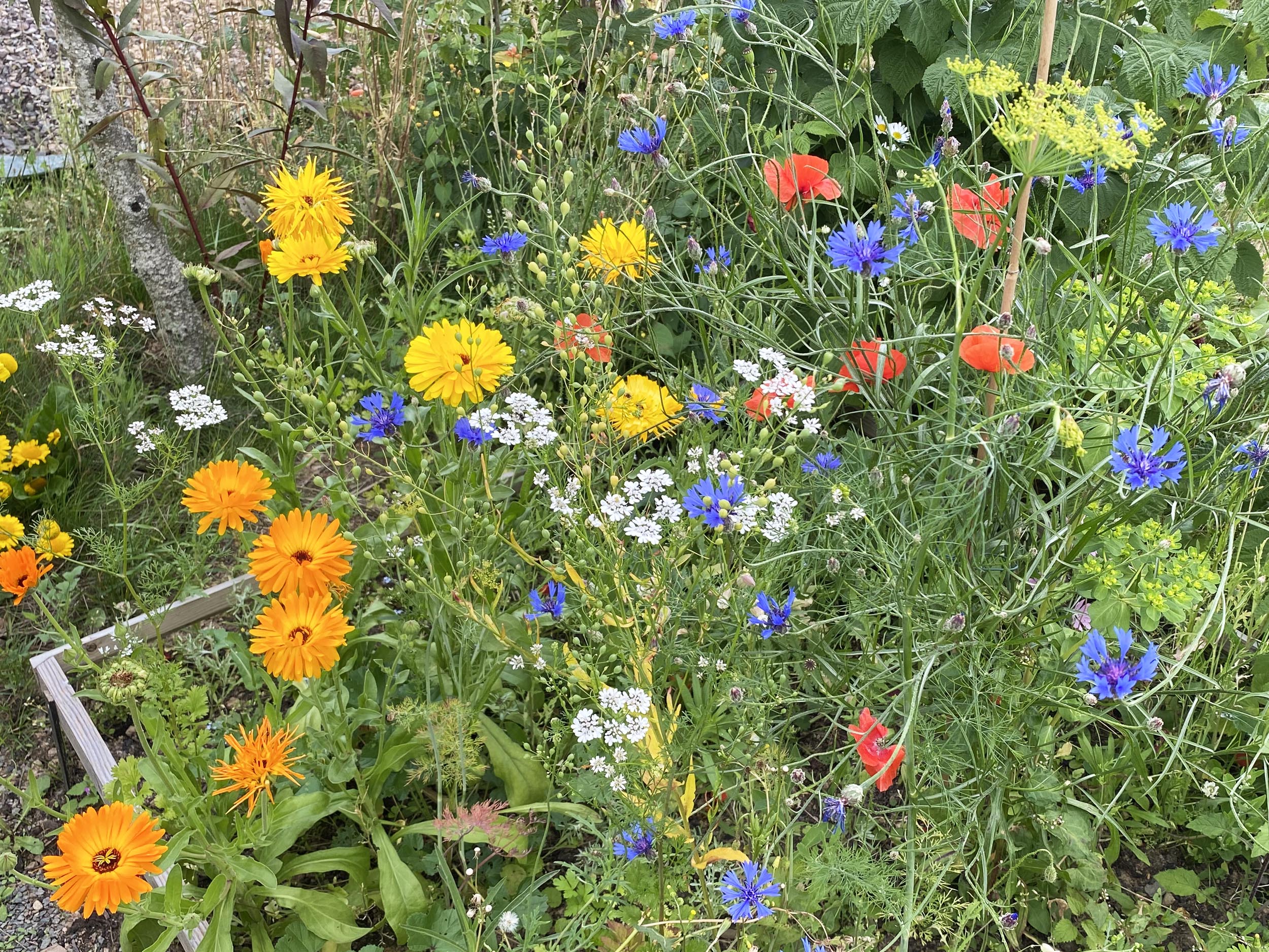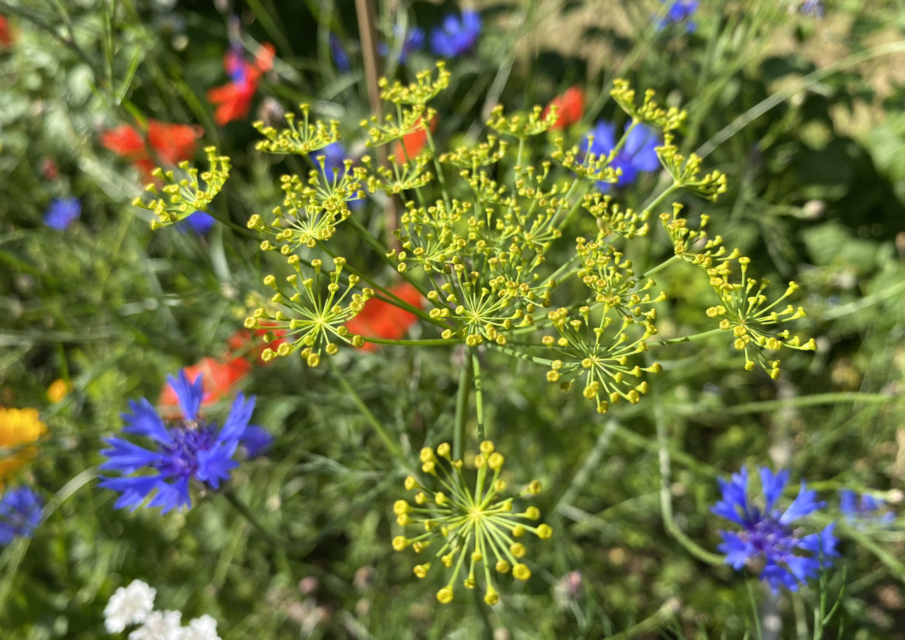 Meine Blumenmischung enthielt: Dill, Borretsch, Ringelblume, Leindotter, Koriander, Fenchel, Schwarzkümmel, Kornrade, Odermennig, Kornblume, Gemeine Wegwarte, Möhre, Wilde Karde, Gewöhnlicher Natternkopf, Färberwaid, Echtes Leinkraut, Kuckucks-Lichtnelke, Wilde Malve, Weißer Steinklee, Gelber Steinklee, Klatschmohn, Pastinak, Taubenkropf-Leimkraut, Strauß-Margerite, Rainfarn